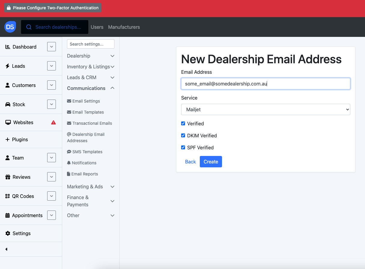 To send emails through your dealership domain, a one-time setup is required on your domain settings.