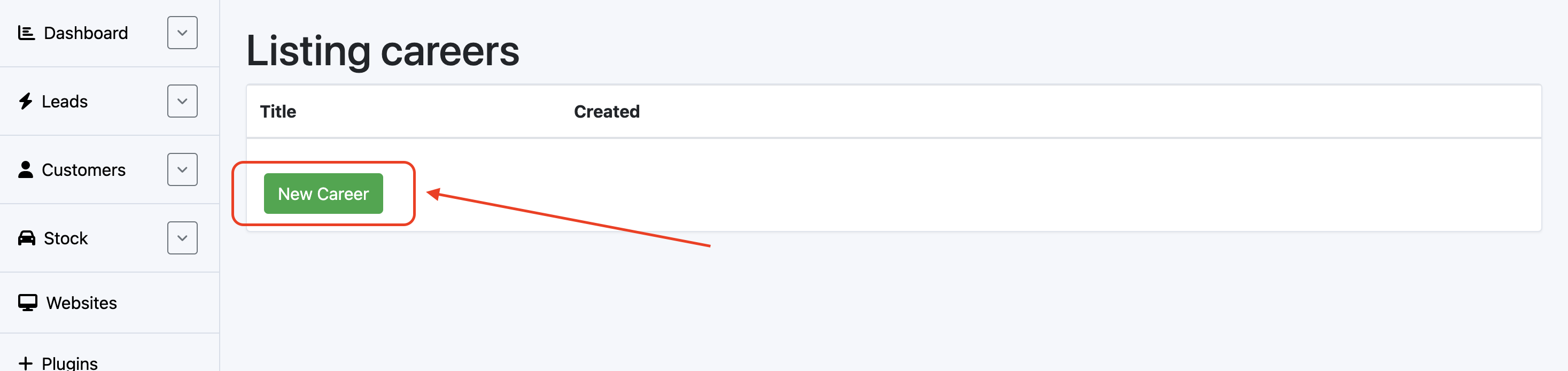 On the careers page, you will be presented with a list of careers that your dealership has made. To add a new career, select the green New Career button.