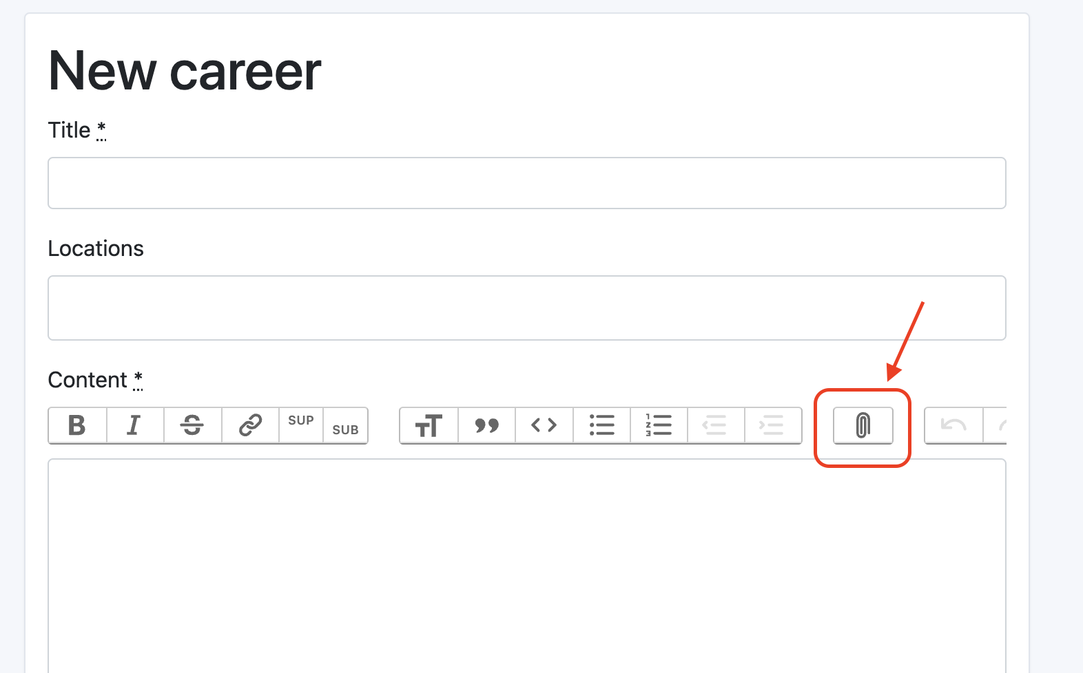 The Locations drop-down allows you to select one or multiple locations based on where you're hiring. Below, you can add Content such as the job description, and attach files by clicking the paperclip button. Ensure to select Create Career to finalise your changes.