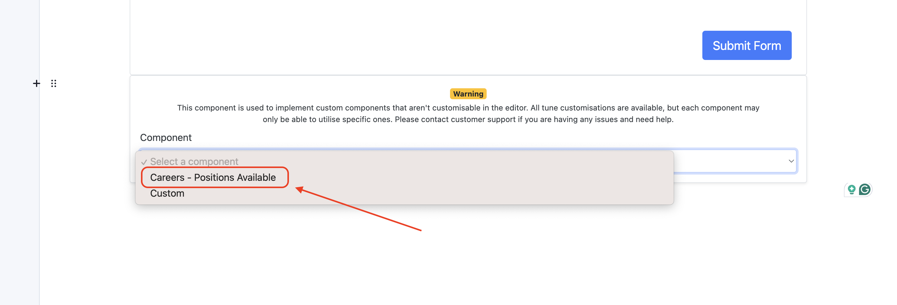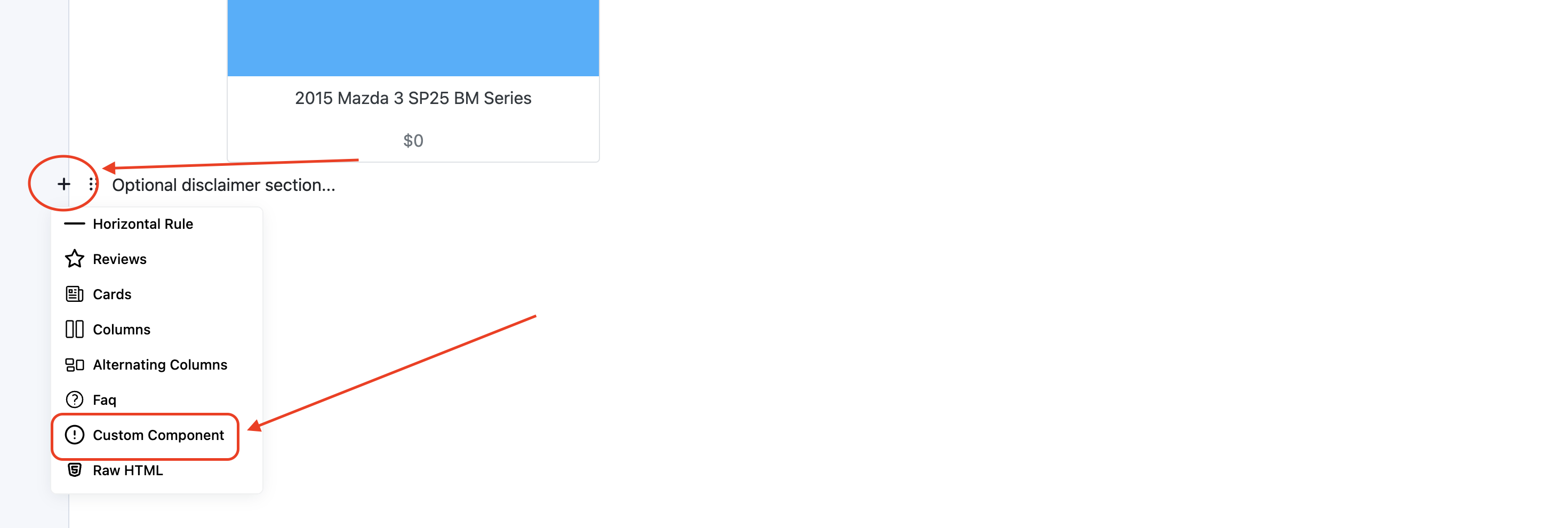 Step 5: Navigate to the desired area of the page. Hover your mouse over the left-hand side until the + icon appears. Click on the icon, then scroll down and select the Custom Component button.