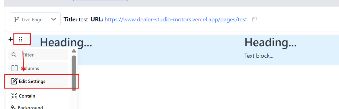 Text with Heading... and Text block... will appear. Hover your mouse over the left-hand side of the page where this text is until the 6 dots icon appears. Click on the icon, then select the Edit Settings button.