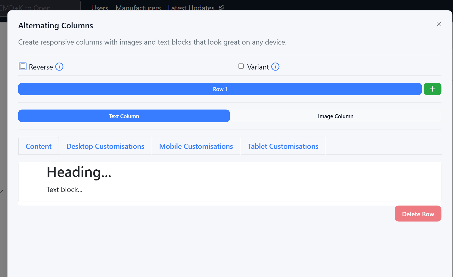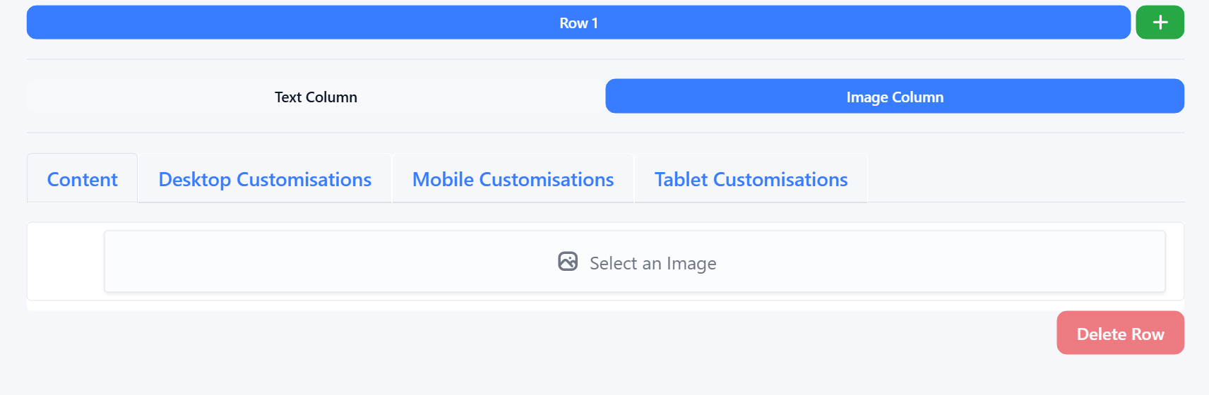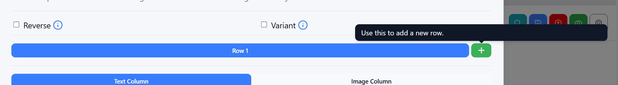 - Below adding rows, you can switch between the text column and the image column. If each row includes both an image and text, ensure you add the content to the appropriate column to maintain the alternating layout between rows.