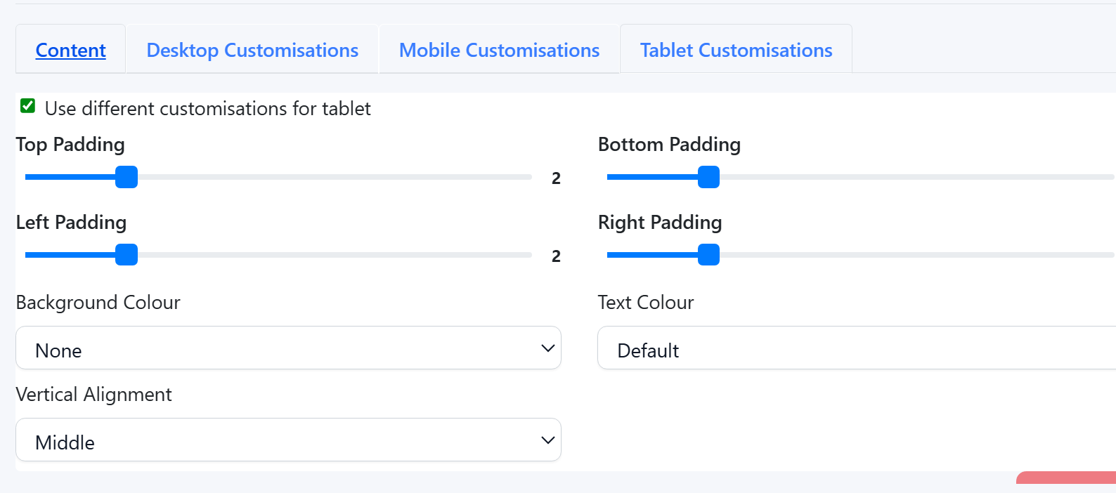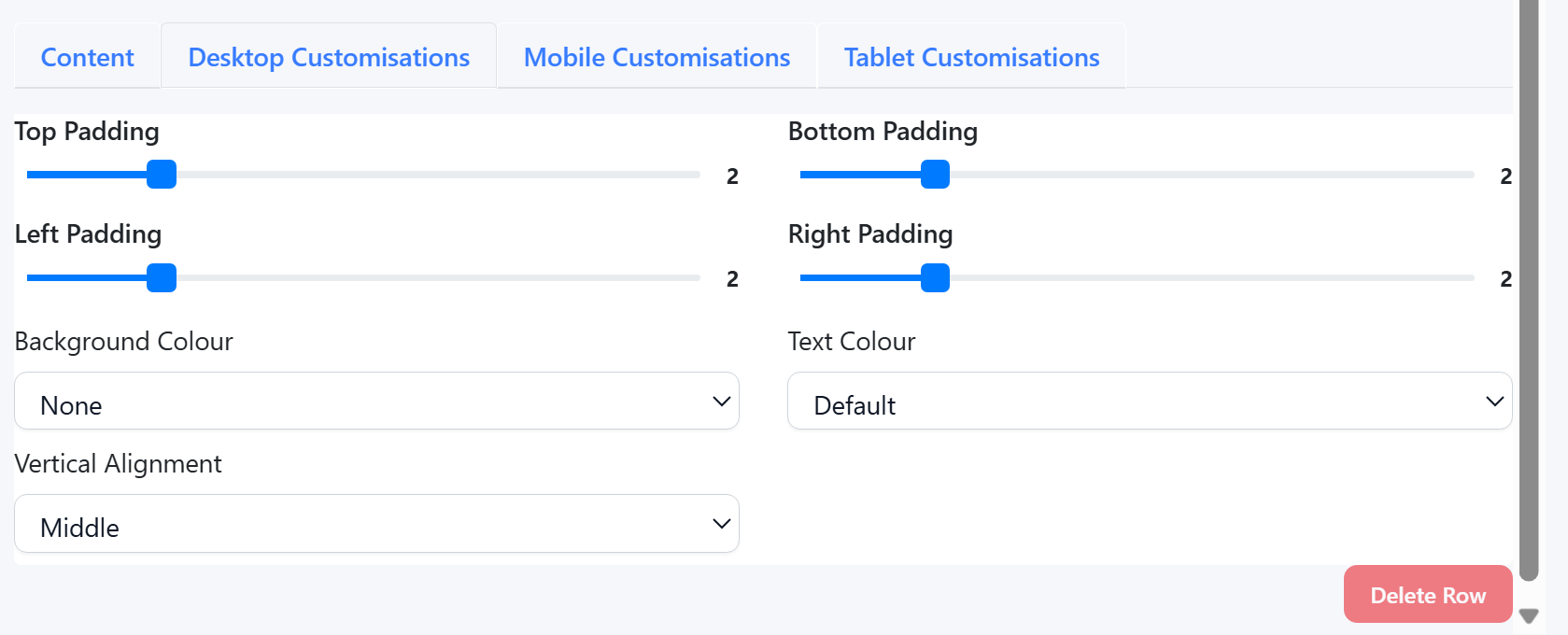 - Vertical Alignment: Positions content vertically within its container (top, centre, or bottom).