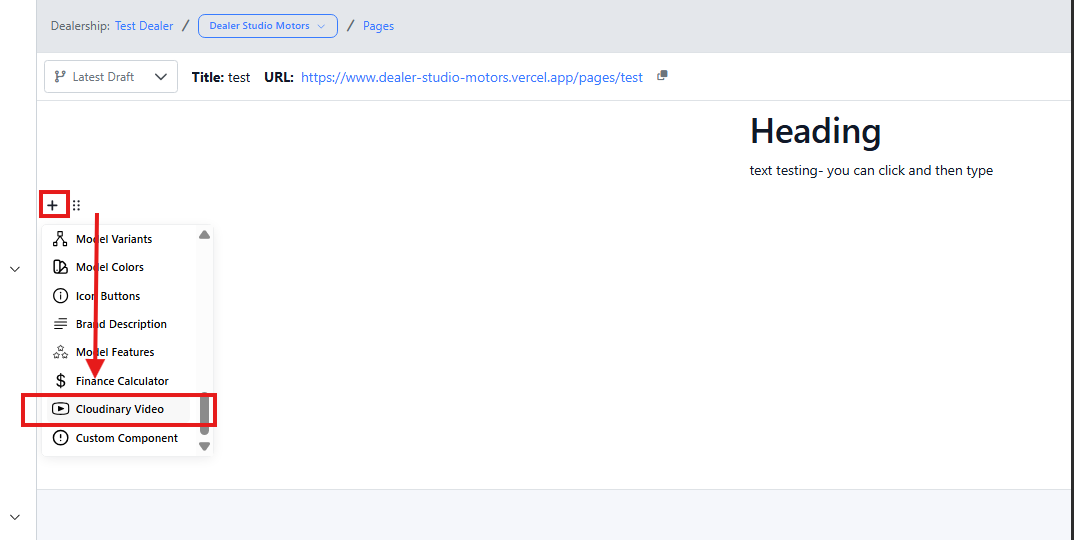 Navigate to the desired area of the page. Hover your mouse over the left-hand side until the + icon appears. Click on the icon, then scroll down and select the Cloudinary Video button.