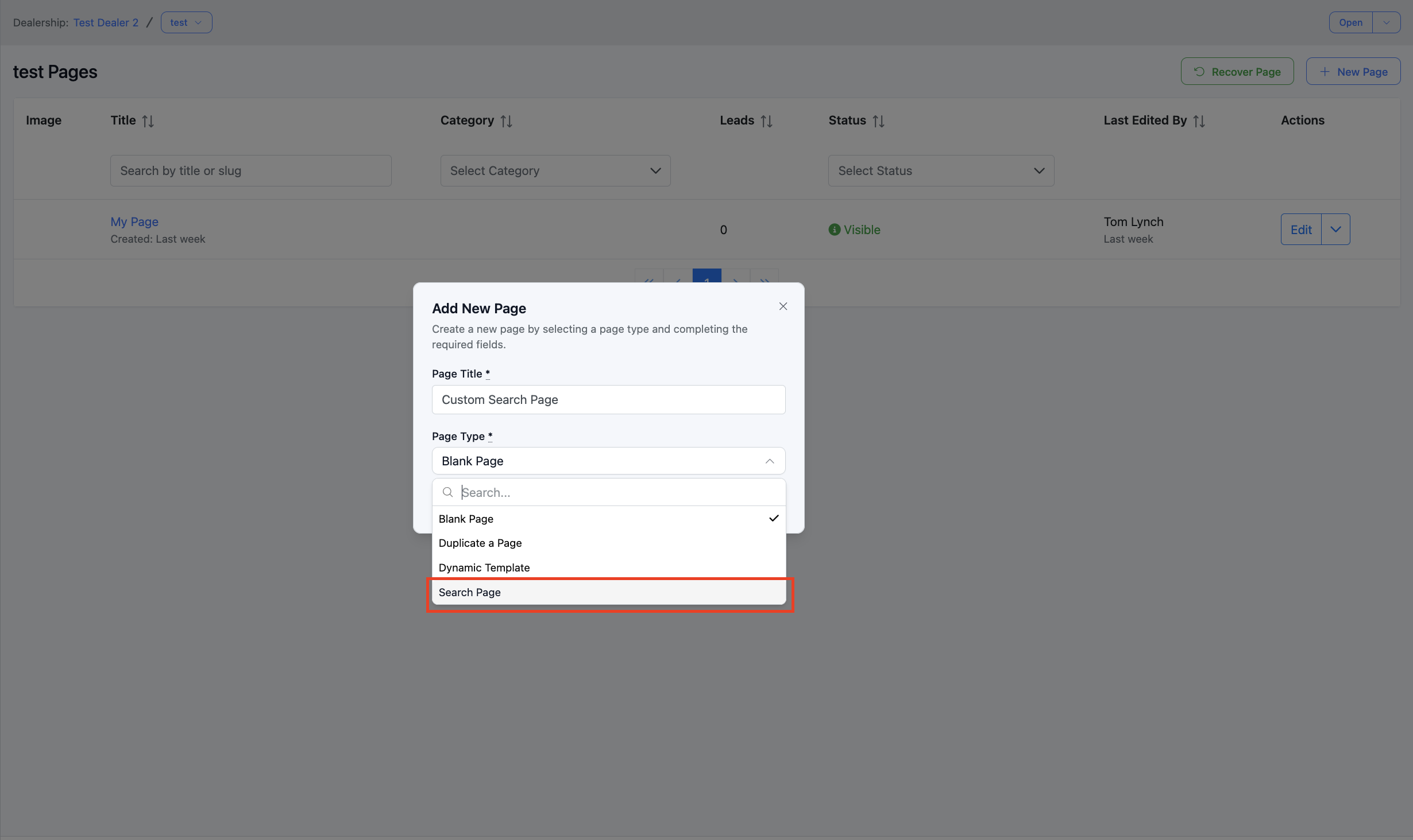 3. Select 'Search Page'