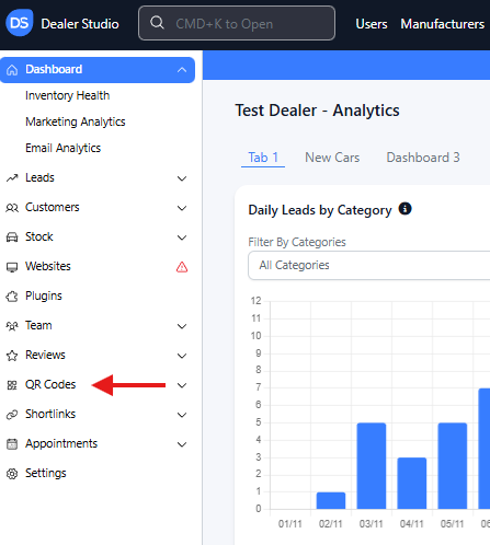 From the Dealer Level, use the left-hand sidebar and select QR Codes.