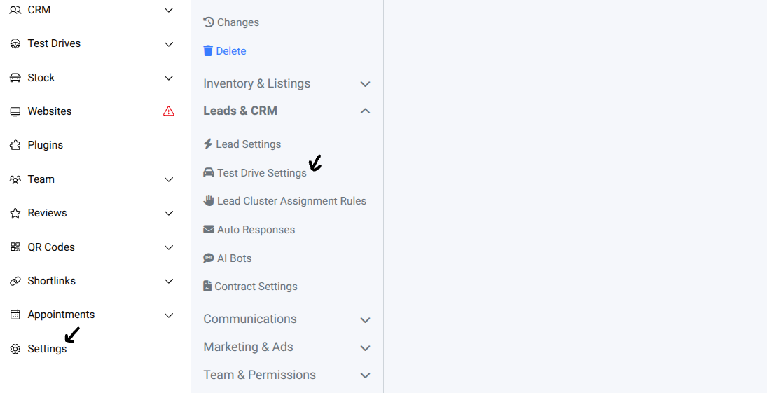 Select → Leads & CRM → Test Drive Settings