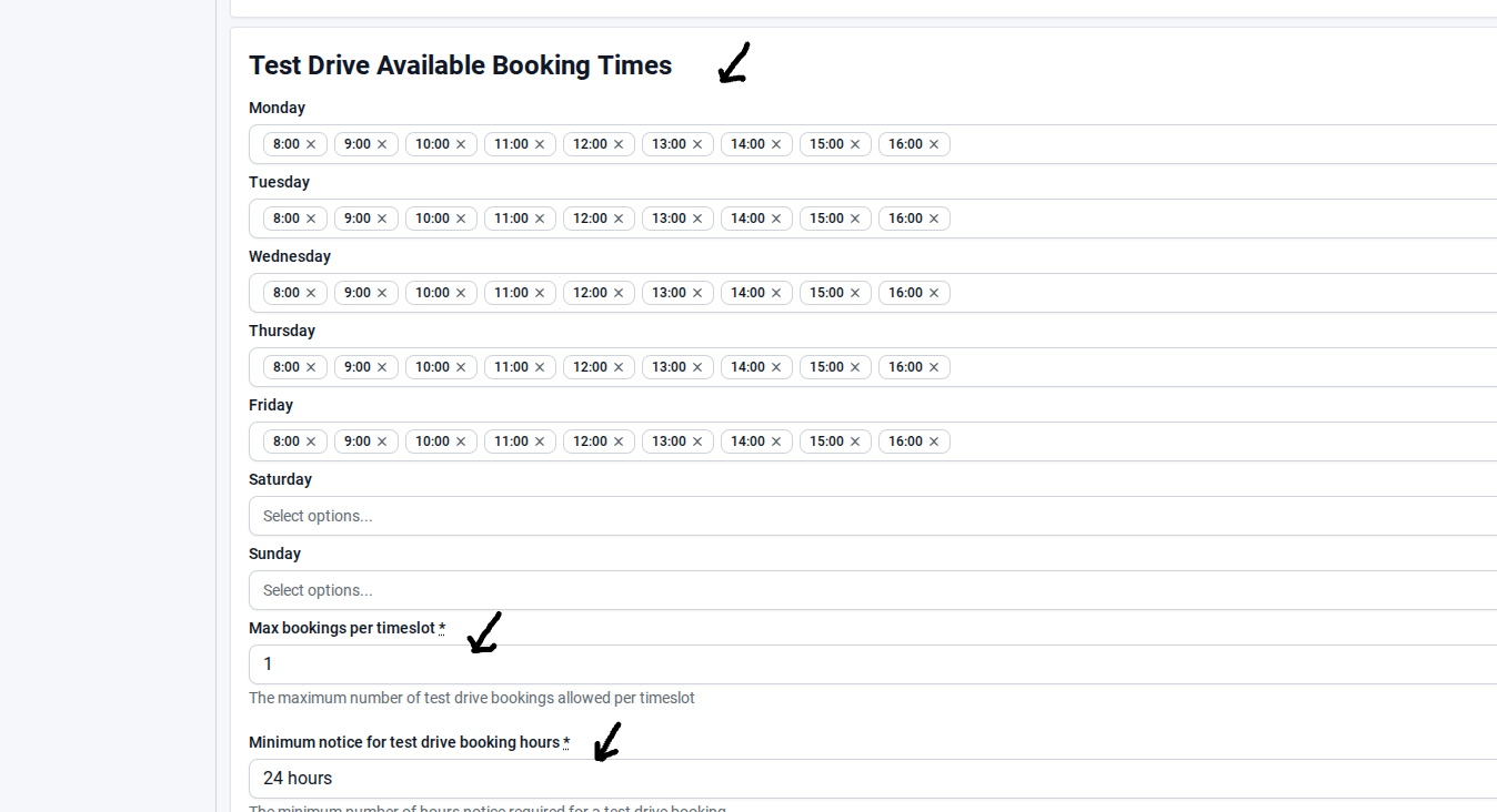 Adjust Minimum Notice: Modify the minimum notice required for customers to book a test drive.