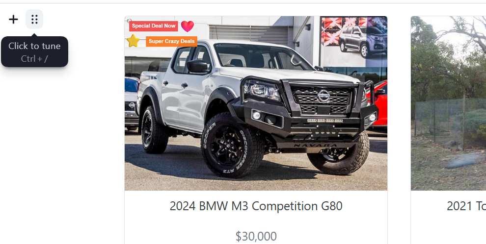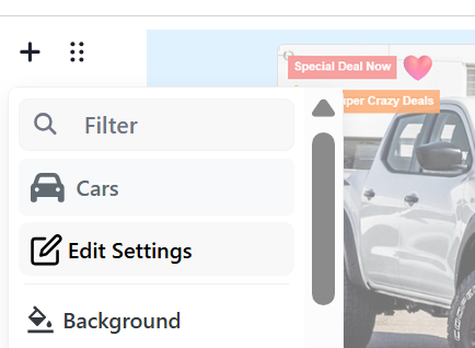 1. Navigate to the desired area of the page. Hover your mouse over the left-hand side until the '+' icon appears. Click on the icon, then scroll down and select the Cars button.
