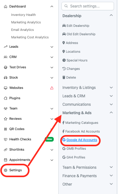 #Step 1: From your dealer level, select Settings and then select Google Ad Accounts