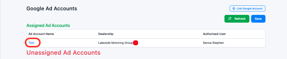 #Step 2: You will then click Link Google Account and log into your google ad account via the pop up, once you are logged in you will be taken back to the below screen where you can select an ad account to assign to the dealer.