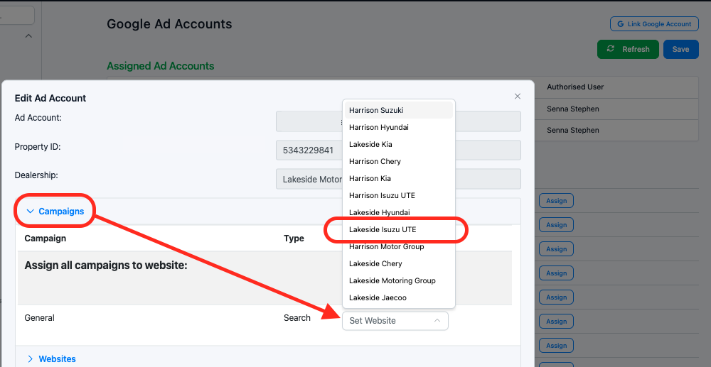 #Step 3: Once you have assigned an ad account click the ad accounts name to assign the campaigns to a website.