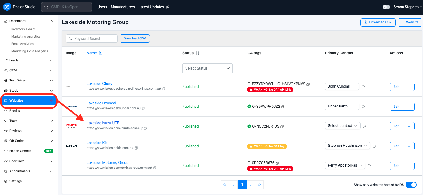 #Step 5: We can now set up the Analytics Dash in the website level. To get there go to Websites and select the site that the ads are now connected to