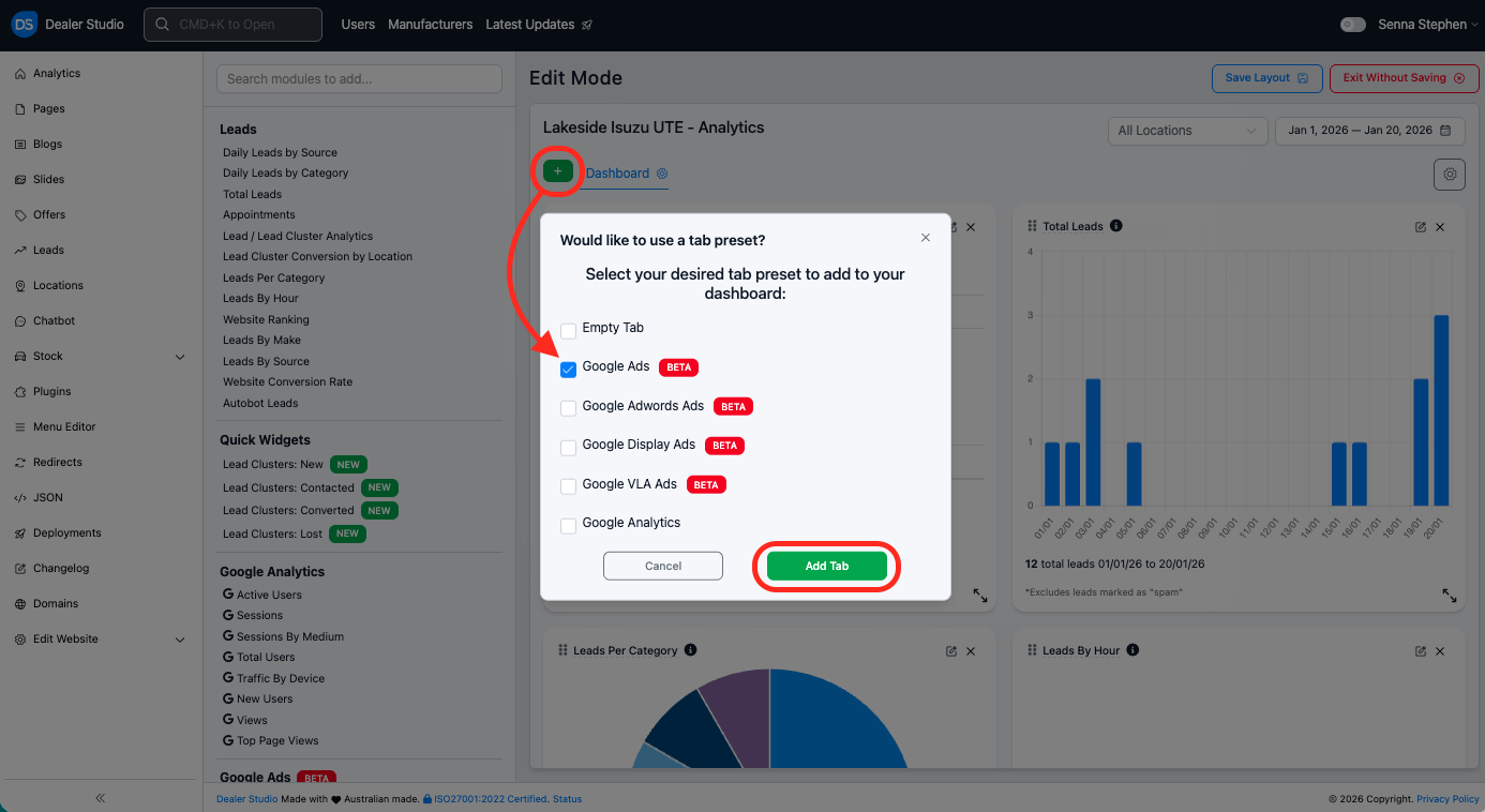 #Step 7: Click the green Plus button on the left and then select Google Ads OR Google Display Ads depending on what ads you have live and then click Add Tab