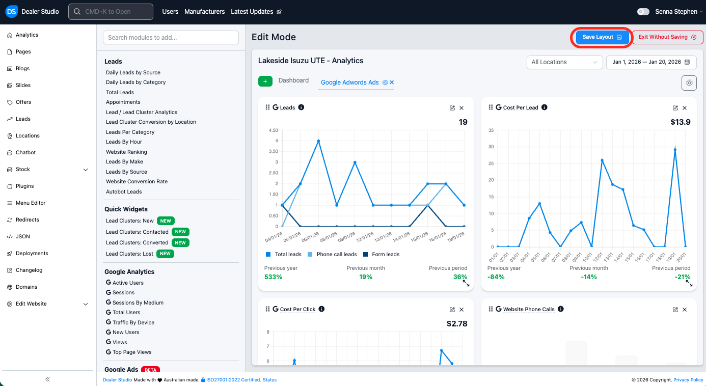 #Step 8: This will then connect your ads to your DS dashboard, you can resize and edit the widgets or add another tab for your Google VLA ads if you have them running. Once you are happy with your dashboard you will need to click Save Layout. And your dashboard will be ready to use! The steps are the same for Facebook.