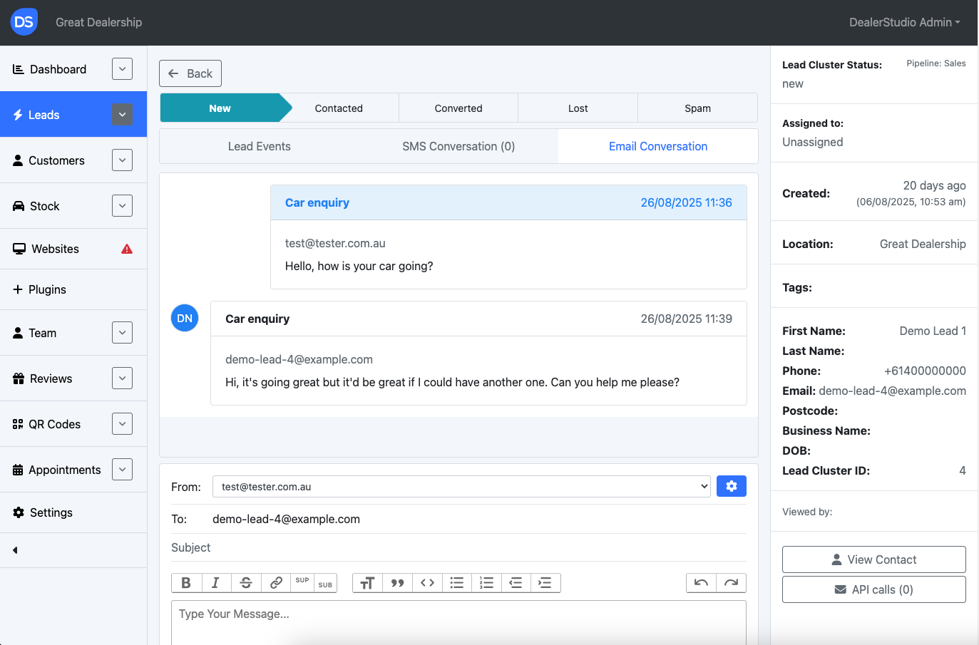Incoming emails can also appear in Dealer Studio if forwarding is configured.