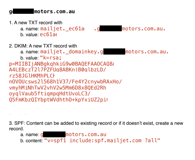 Once Mailjet is ready, Dealer Studio support team will provide the dealership (you) with the DNS records you need to add to your dealership's domain.