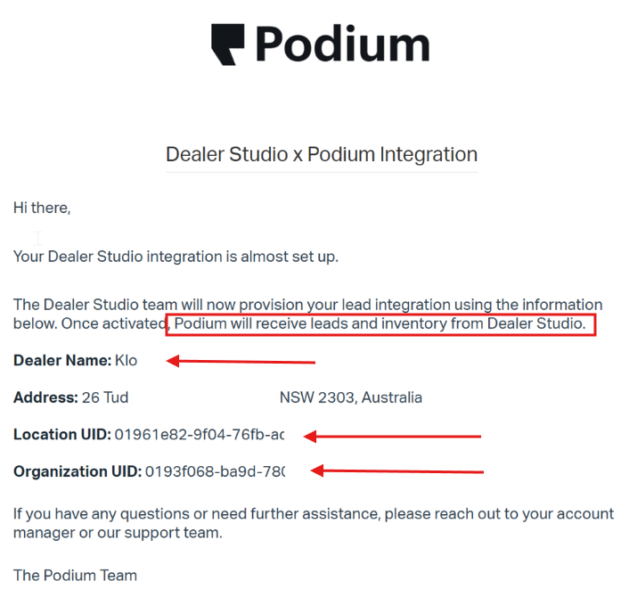 The Organization UID links your dealership in Dealer Studio to Podium at an organisation level.