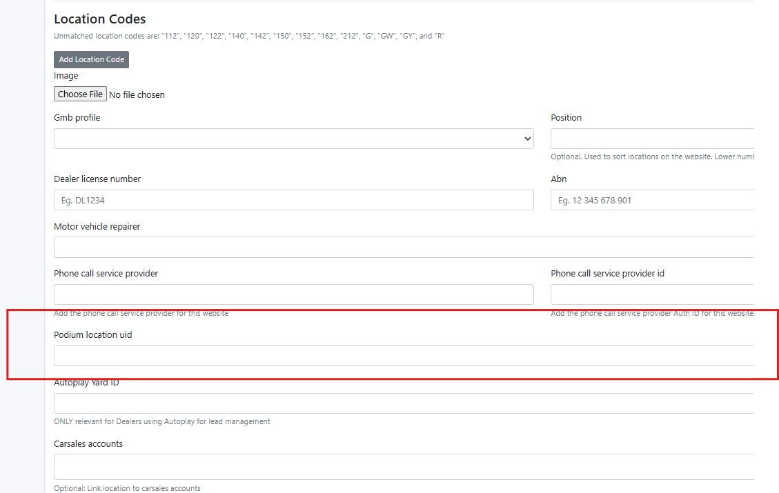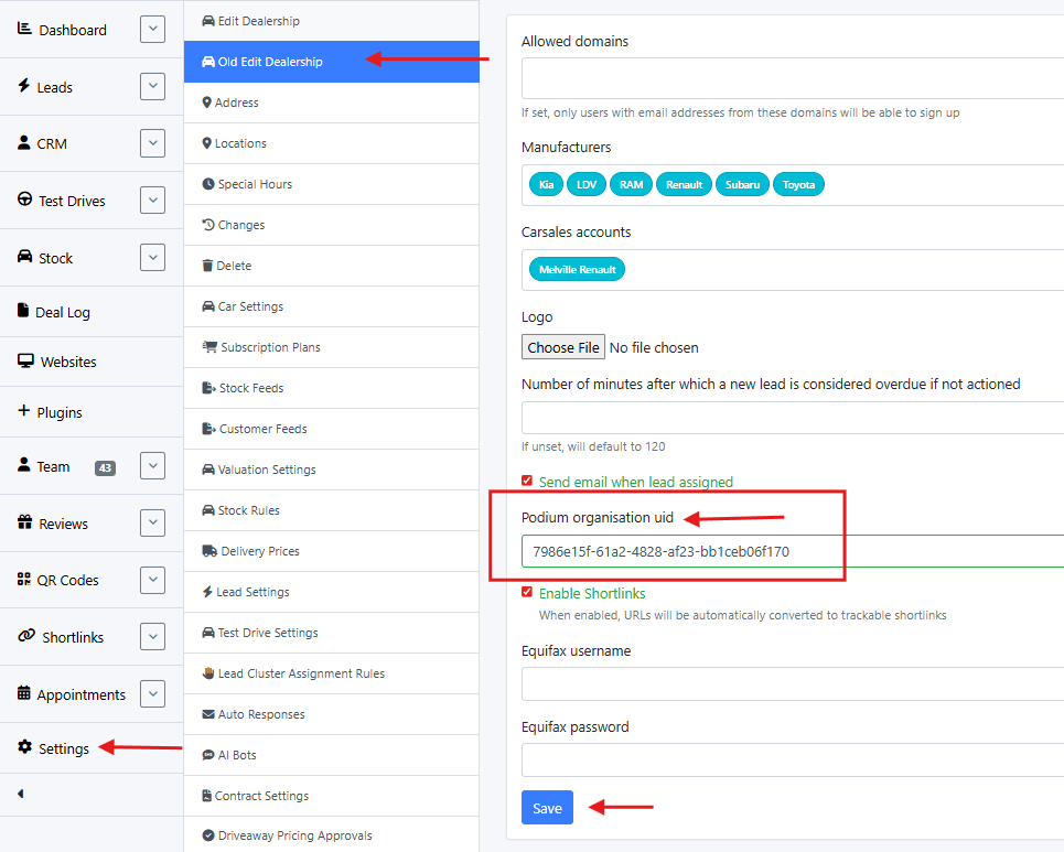 Settings > Old Edit DealershipLocate the Podium Organisation UID field.
