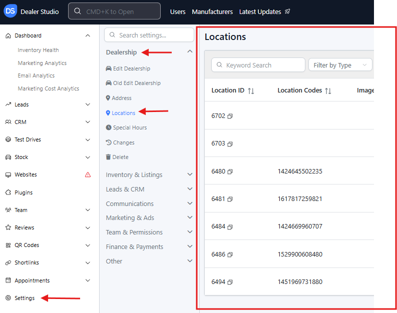 Find and edit the location that matches the dealership name listed in the Podium email.