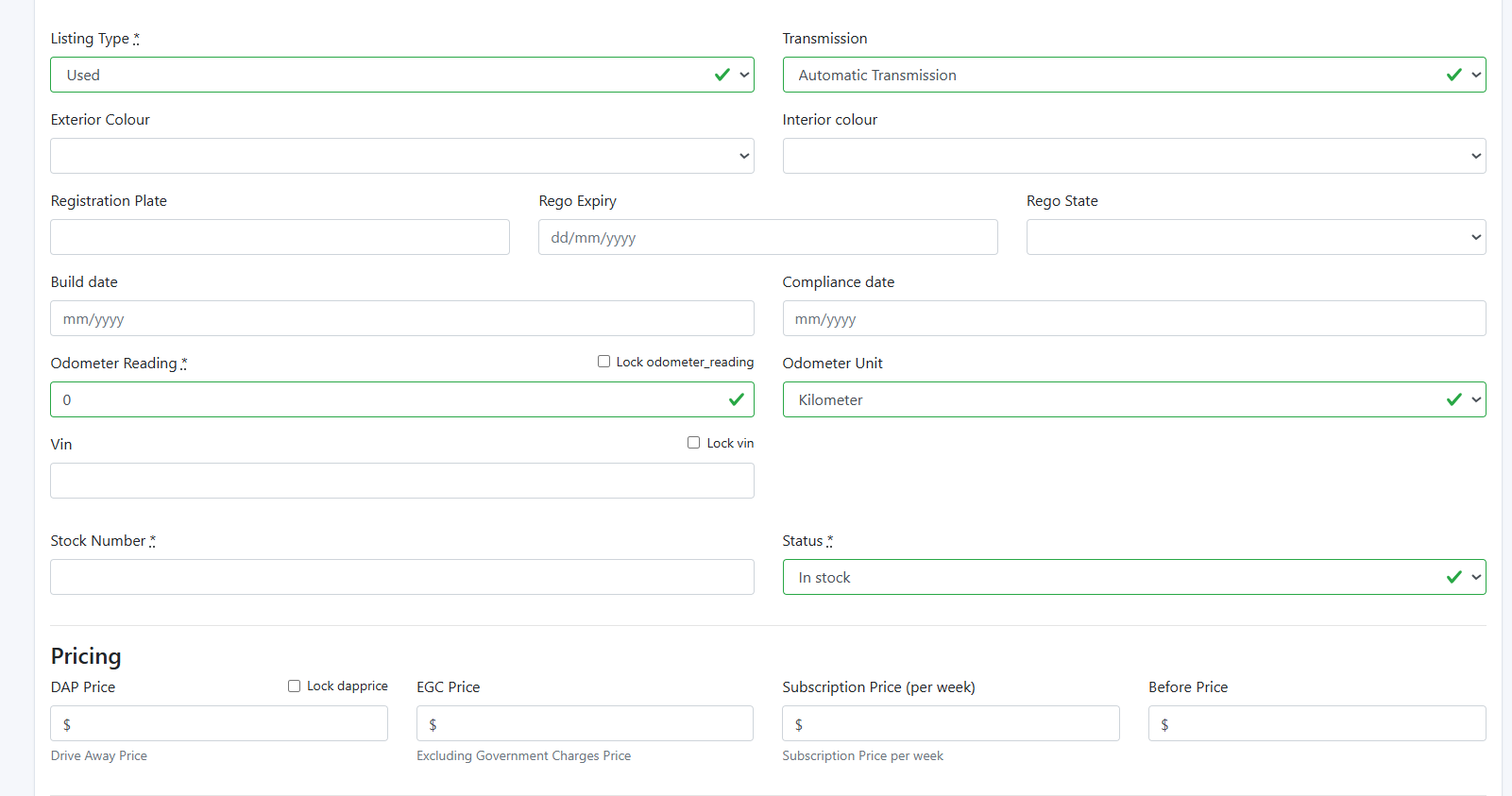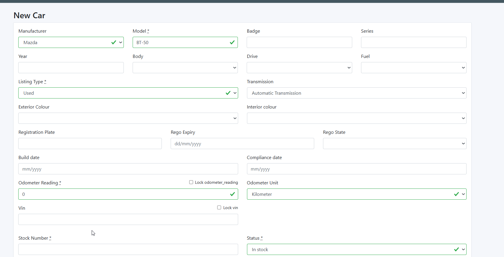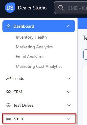 To add stock in Dealer Studio, go to the Stock section, click the + Car button, and choose whether to add the vehicle using Redbook Lookup or by manually entering the details. Mandatory fields must be completed before saving.