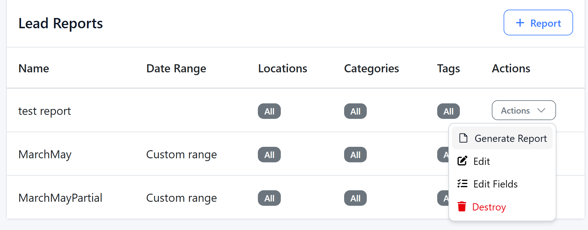 You will then be taken to this page where you can create custom reports; /dealerships/[Dealership-Slug]/lead_clusters/reports