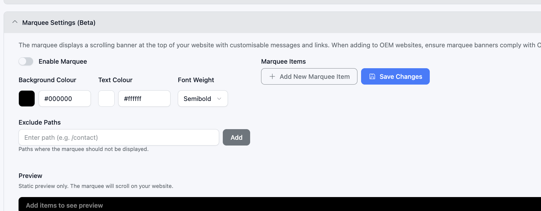 Add Marquee Items – Enter the text you want to display at the top of your website.