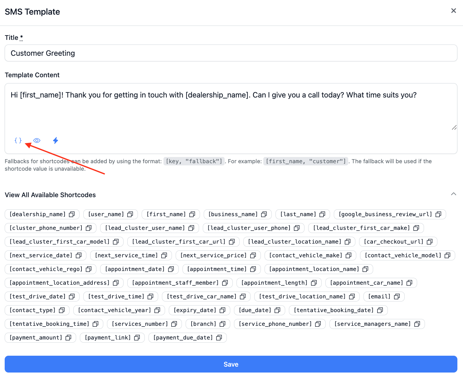 When the SMS is sent, these placeholders are automatically replaced with the relevant contact or dealership data from the system.