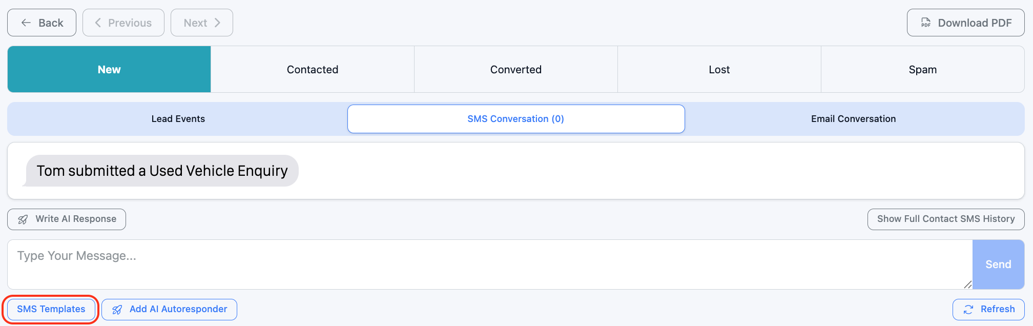 Creating SMS templates allows you to standardise your messaging, save time, and personalise communication using dynamic shortcodes. Once set up, templates can be quickly applied to leads when sending SMS messages.
