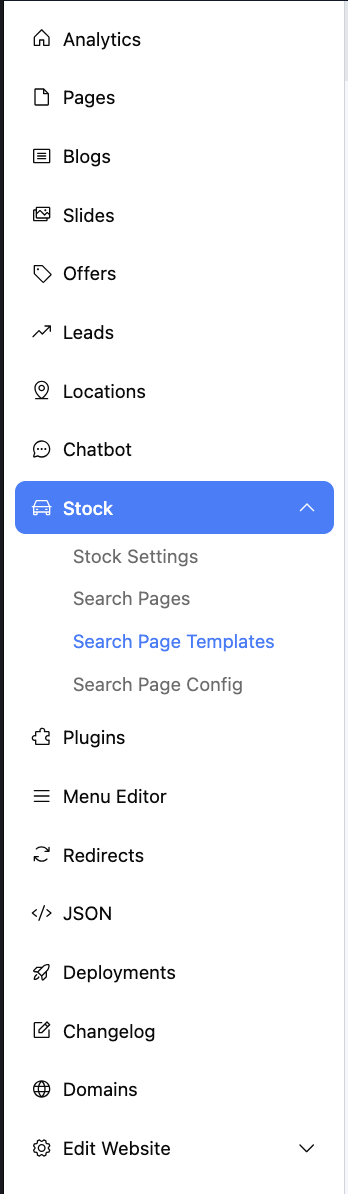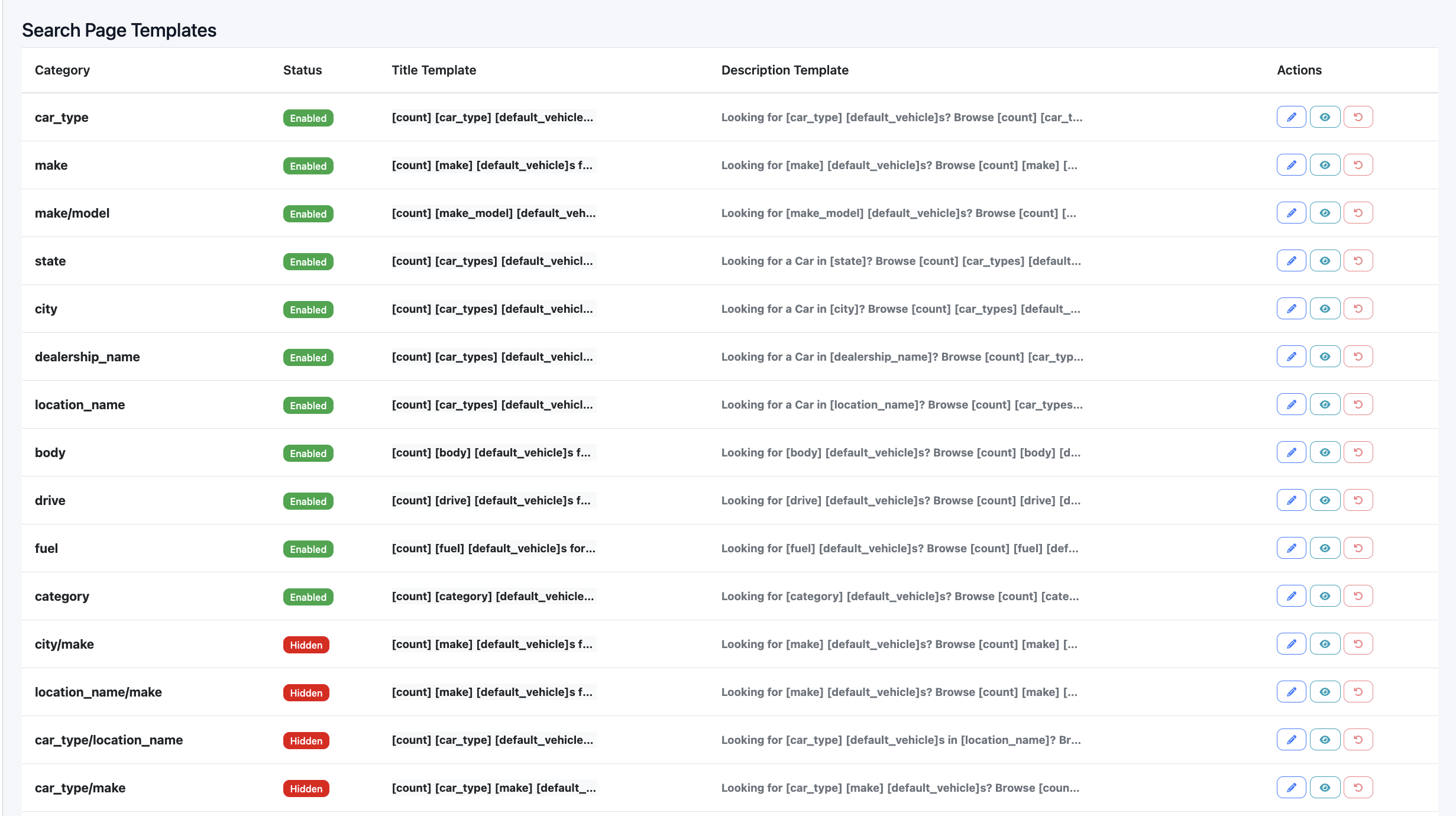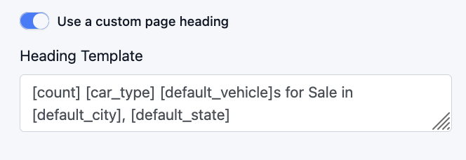 Search page templates control how auto-generated search pages look and read. Each template is tied to a category (e.g. car type, make, make/model, state, city, body type) and defines the patterns used for meta title, meta description, on-page heading, and the “results found” stats line. Templates use shortcodes (e.g. [count], [make], [default_city]) that are replaced with real data when each page is built, so one template drives many pages (e.g. the “make” template for Toyota, Hyundai, etc.). Dealers can override the defaults per website, enable or disable whole categories of generated pages, and optionally use a separate heading template so the on-page heading can differ from the meta title. Together, search page templates define the SEO and copy pattern for all system-generated search pages on a site.
