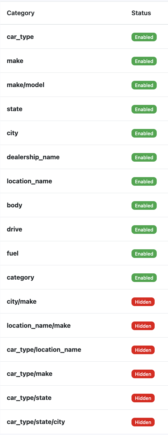 - Single facet: car_type, make, make/model, state, city, dealership_name, location_name, body, drive, fuel, category