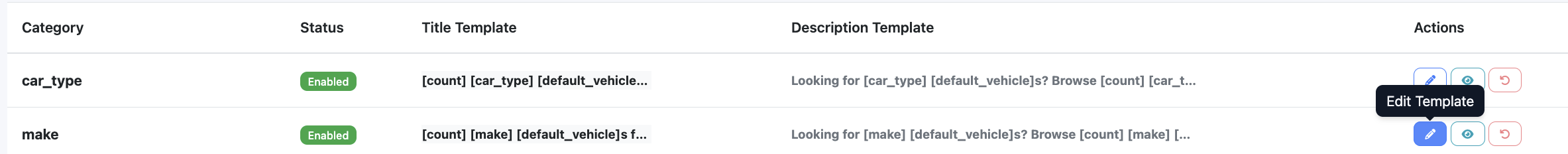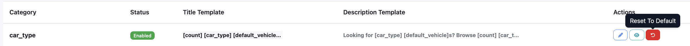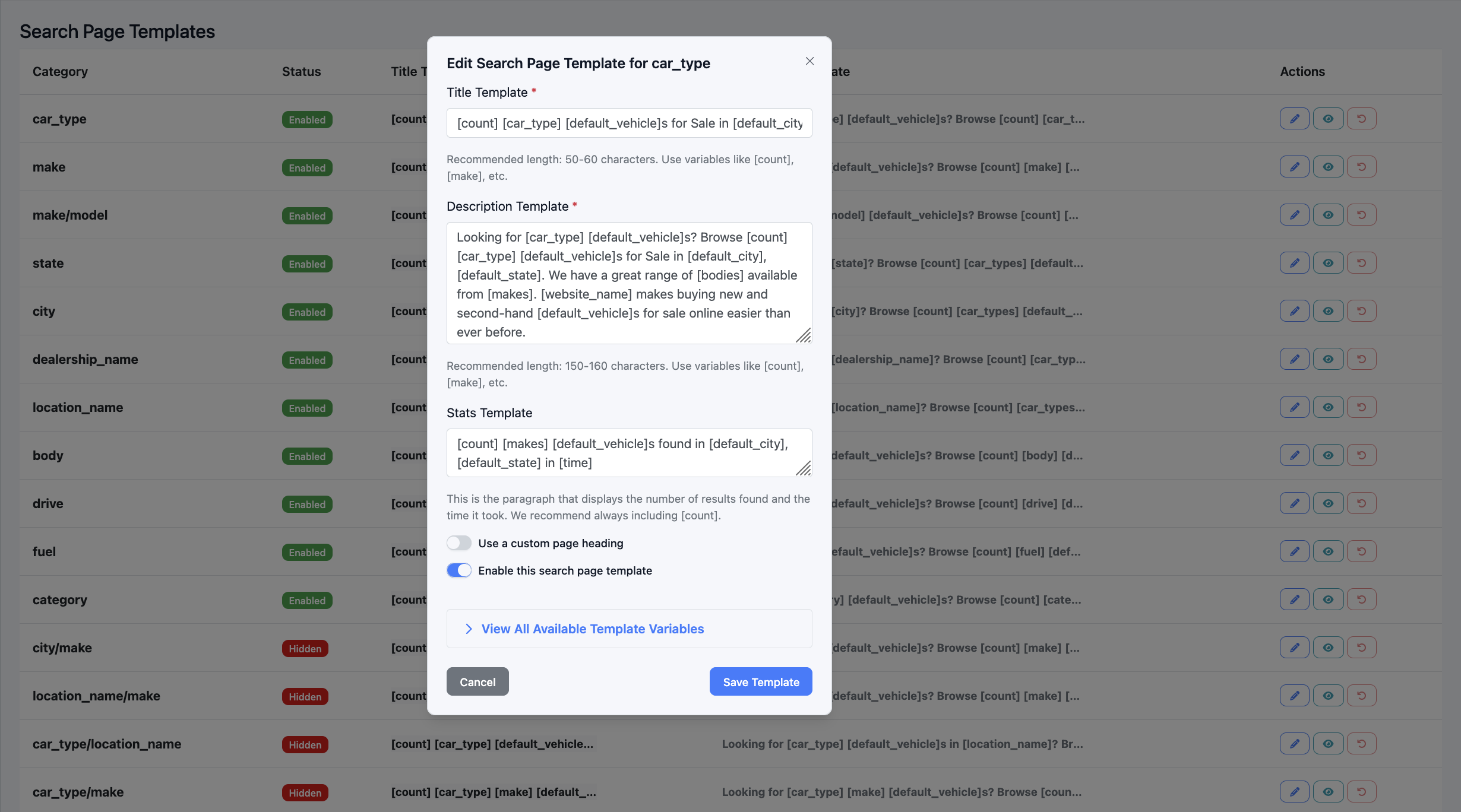 - How: Edit a row → set title, description, stats, optional custom heading, and enable/disable → save. Use variables like [make], [count], [default_city] in the text.
