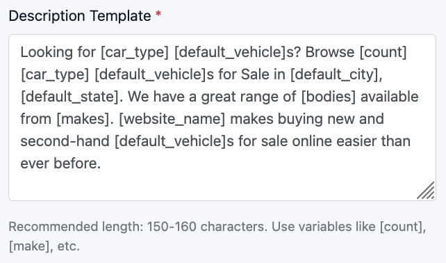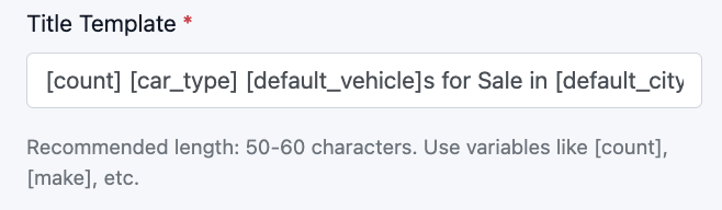 - Use variables in square brackets, e.g. [count] [make] [default_vehicle]s for Sale in [default_city], [default_state].