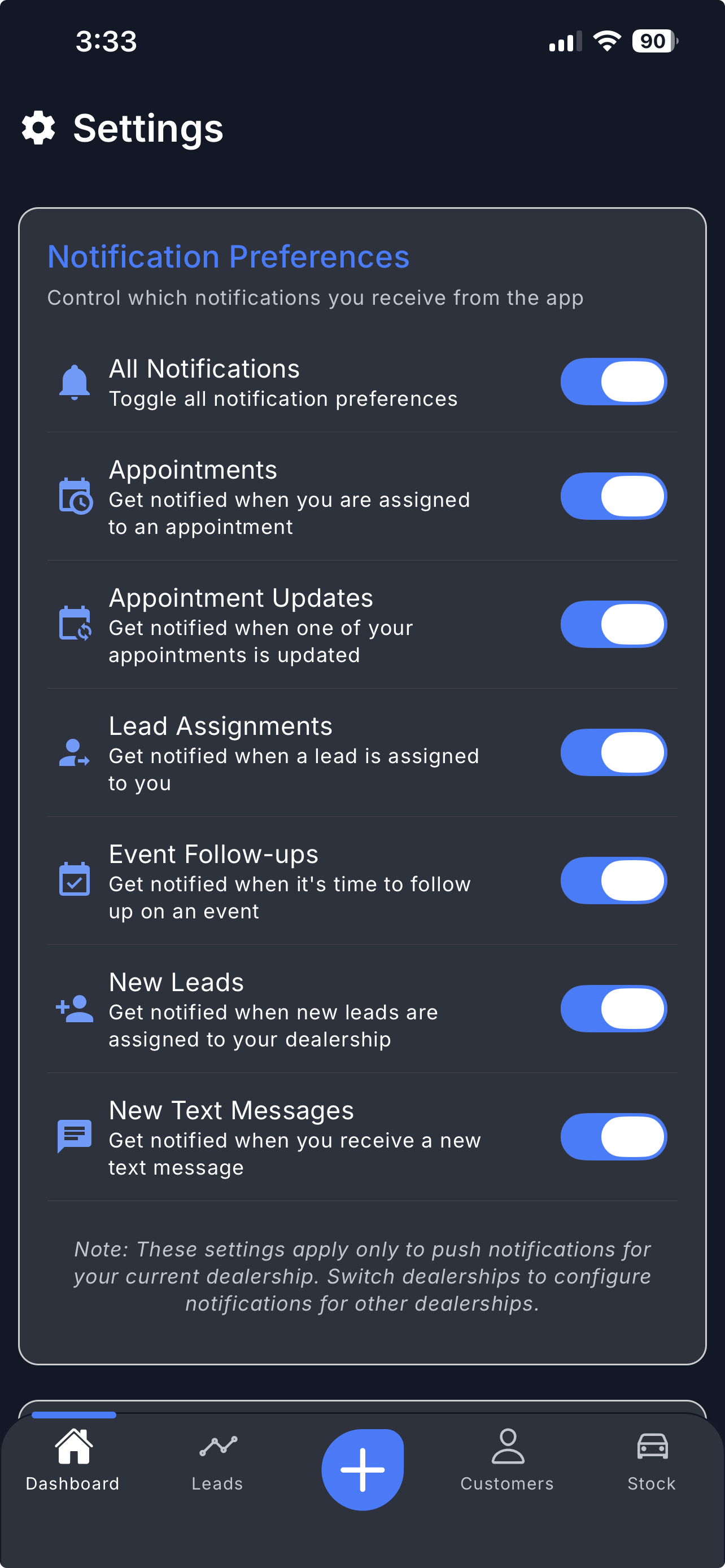 These settings apply only to push notifications for your currently selected dealership.