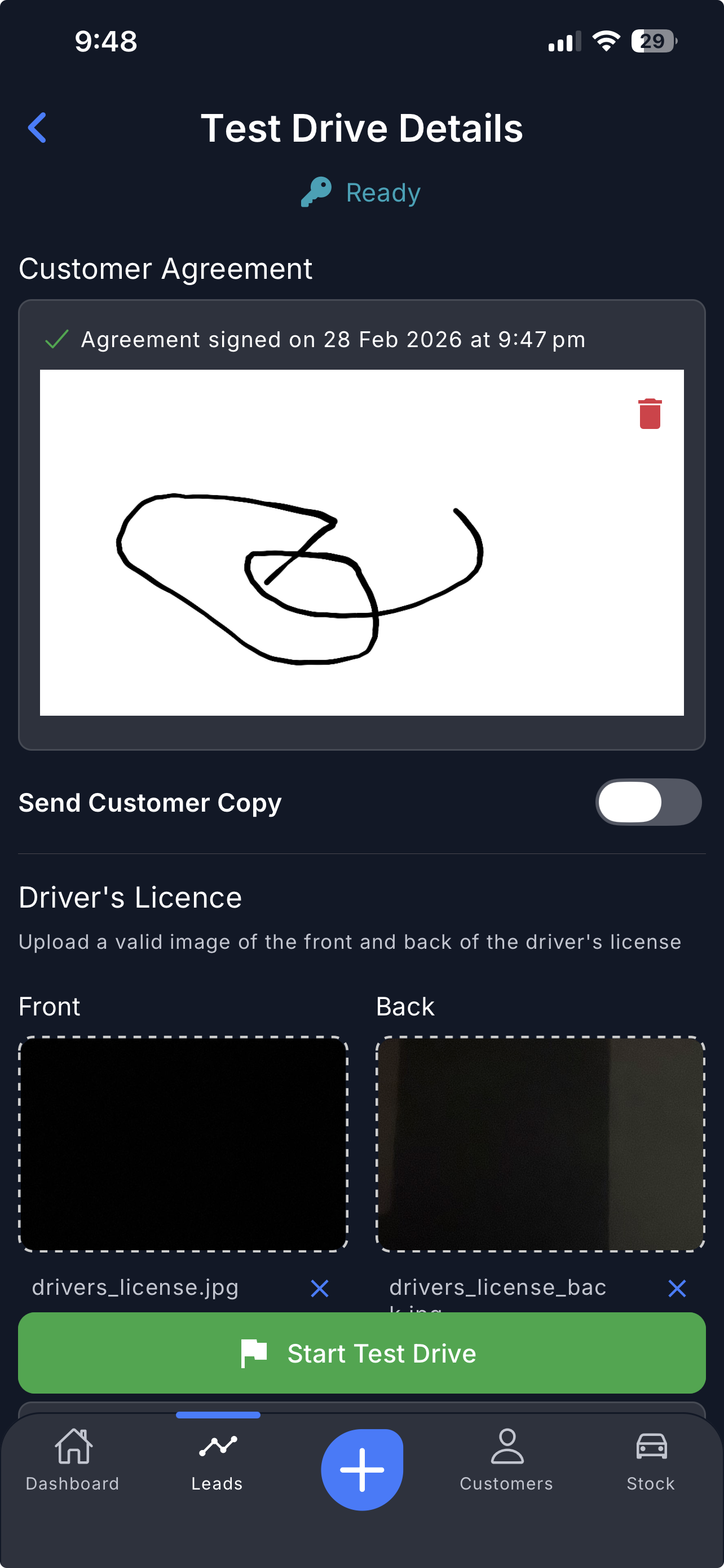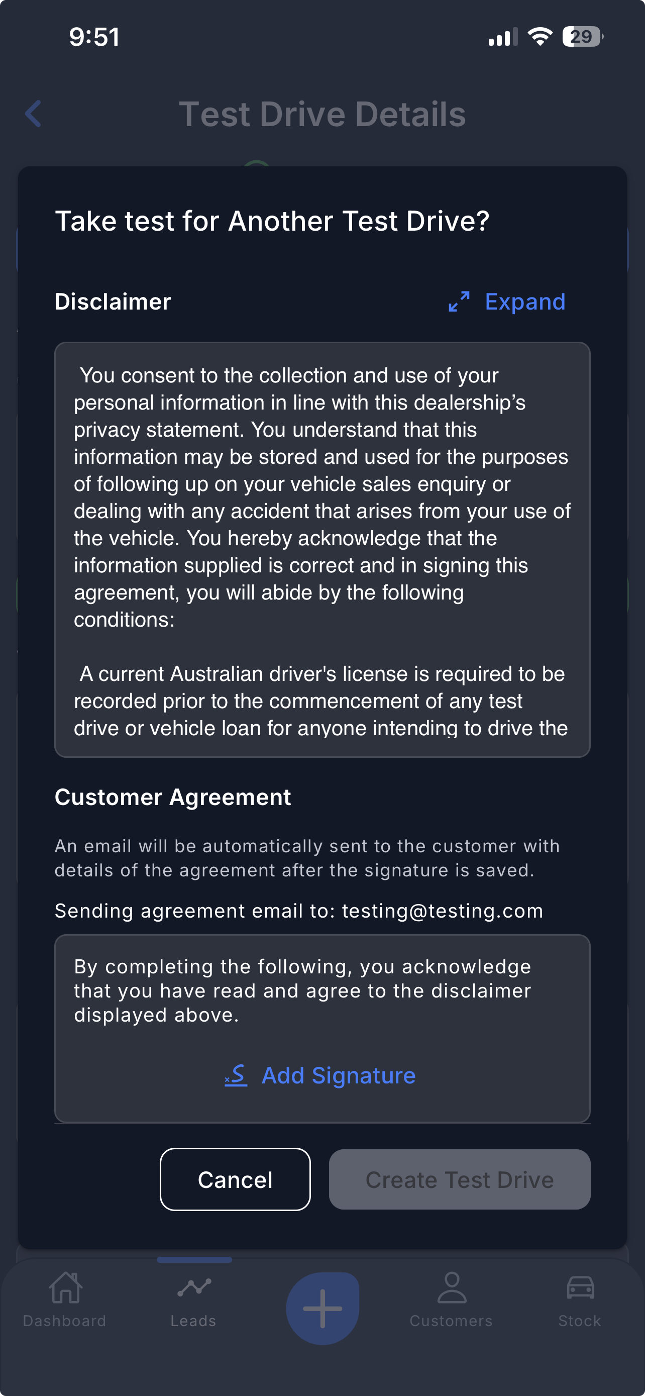 Important: If an additional test drive is started, ensure the customer signs a new agreement before proceeding.