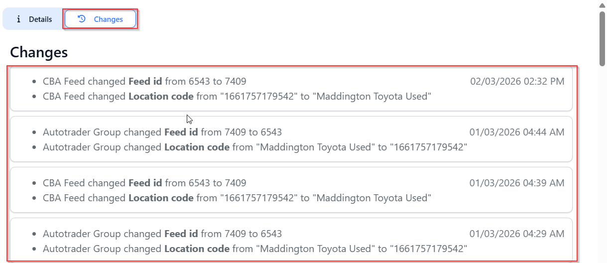 Vehicle Changes tab: Logs all changes made to the vehicle, including the source of the change