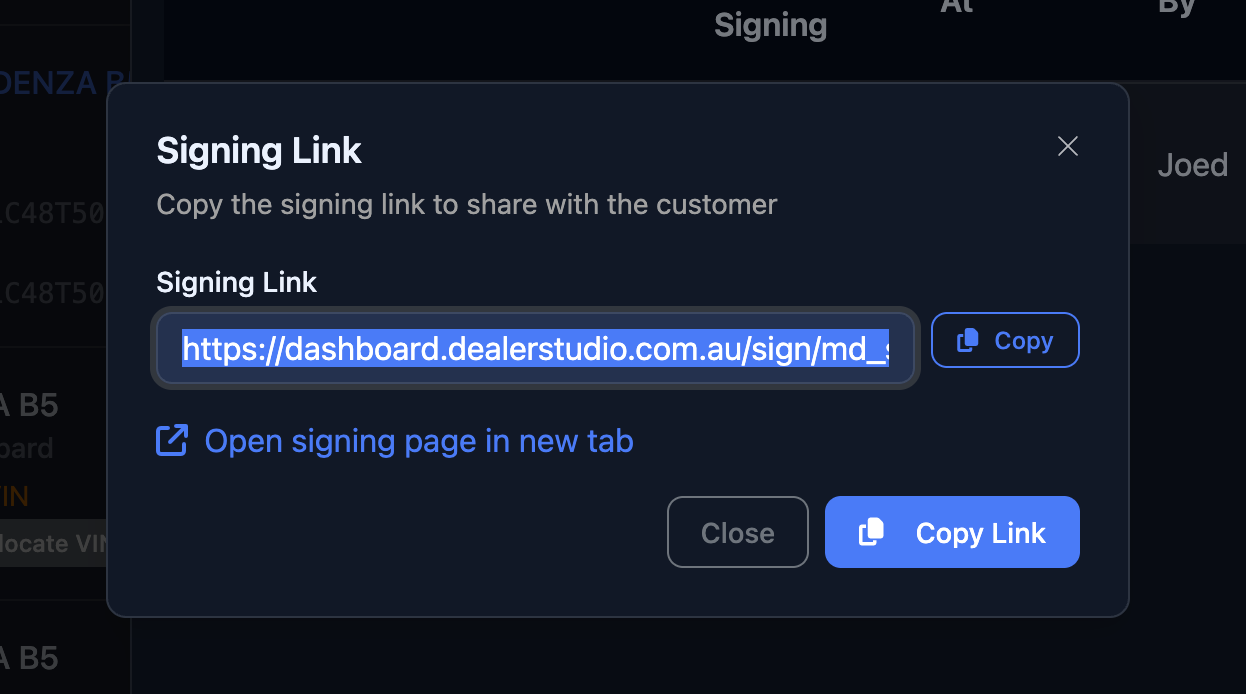 A dialog will appear displaying the customer’s signing link. From here, you can copy the link and paste it into an email, SMS, or other message to send directly to the customer.
