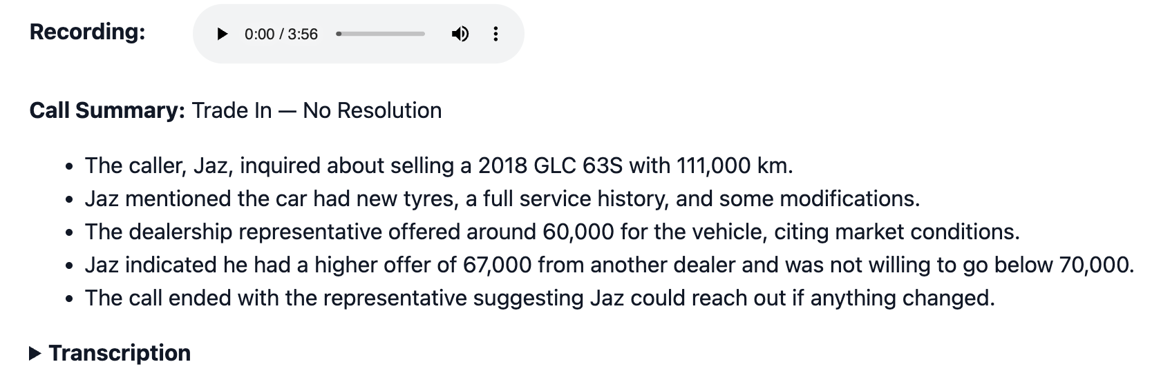 When a phone call is received through your tracking number, Dealer Studio automatically transcribes the call and generates a plain-English summary. The summary appears inside the lead cluster associated with that call.