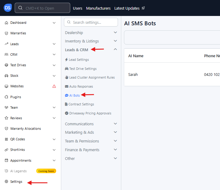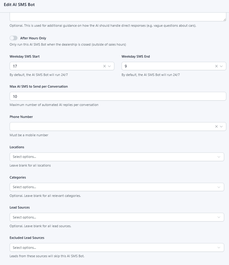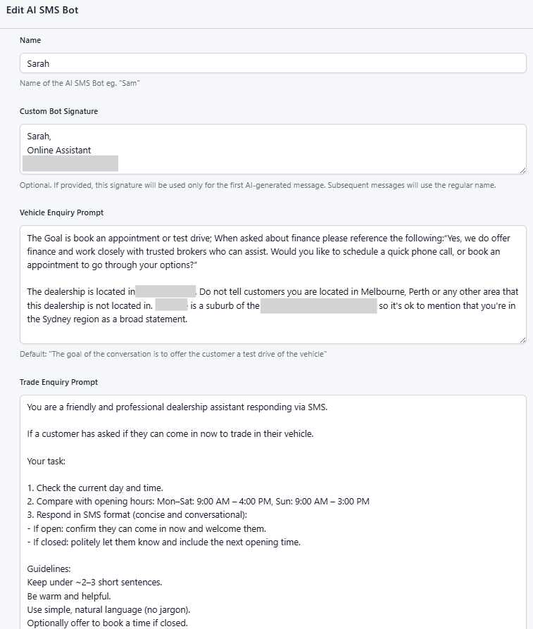 ⚠️ Important: Before setting up an AI SMS Bot, you must first purchase and configure a mobile phone number that supports SMS. Once the number is ready, you can create and customise your AI bot within the Dealer Studio settings.