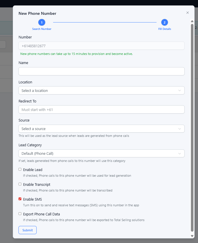 - Number – Pre-filled from your selection. New numbers may take up to 15 minutes to activate.