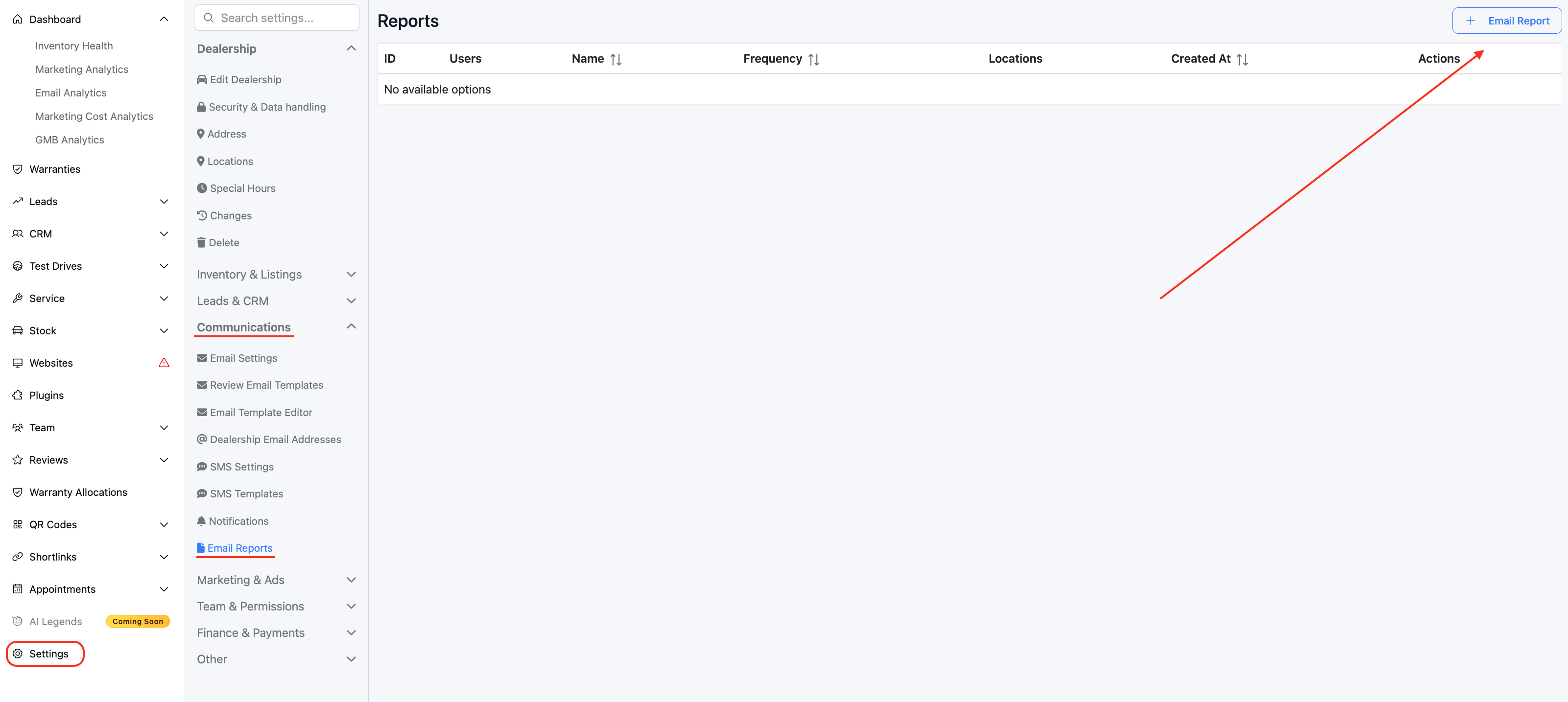 1. On the dashboard head to Settings > Communications > Email Reports > New Report