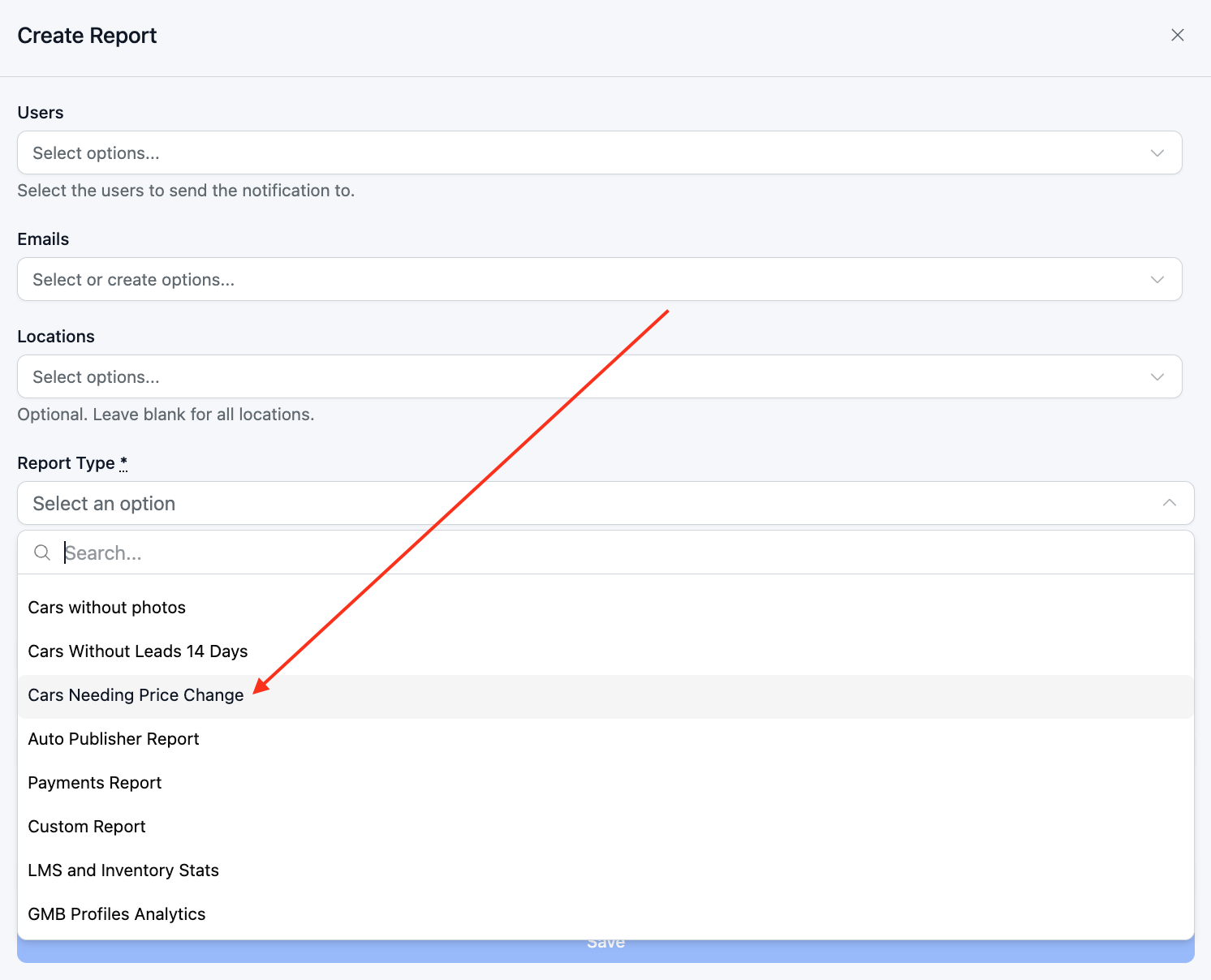 2. Select the users you would like to send the report to, and then select Cars Needing Price Change under Report Type.