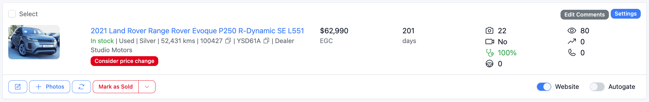 Dealer Studio includes a built-in report to help you stay on top of inventory pricing. When a vehicle has been listed for an extended period without a price update, it will also be flagged with a "Consider price change" indicator.