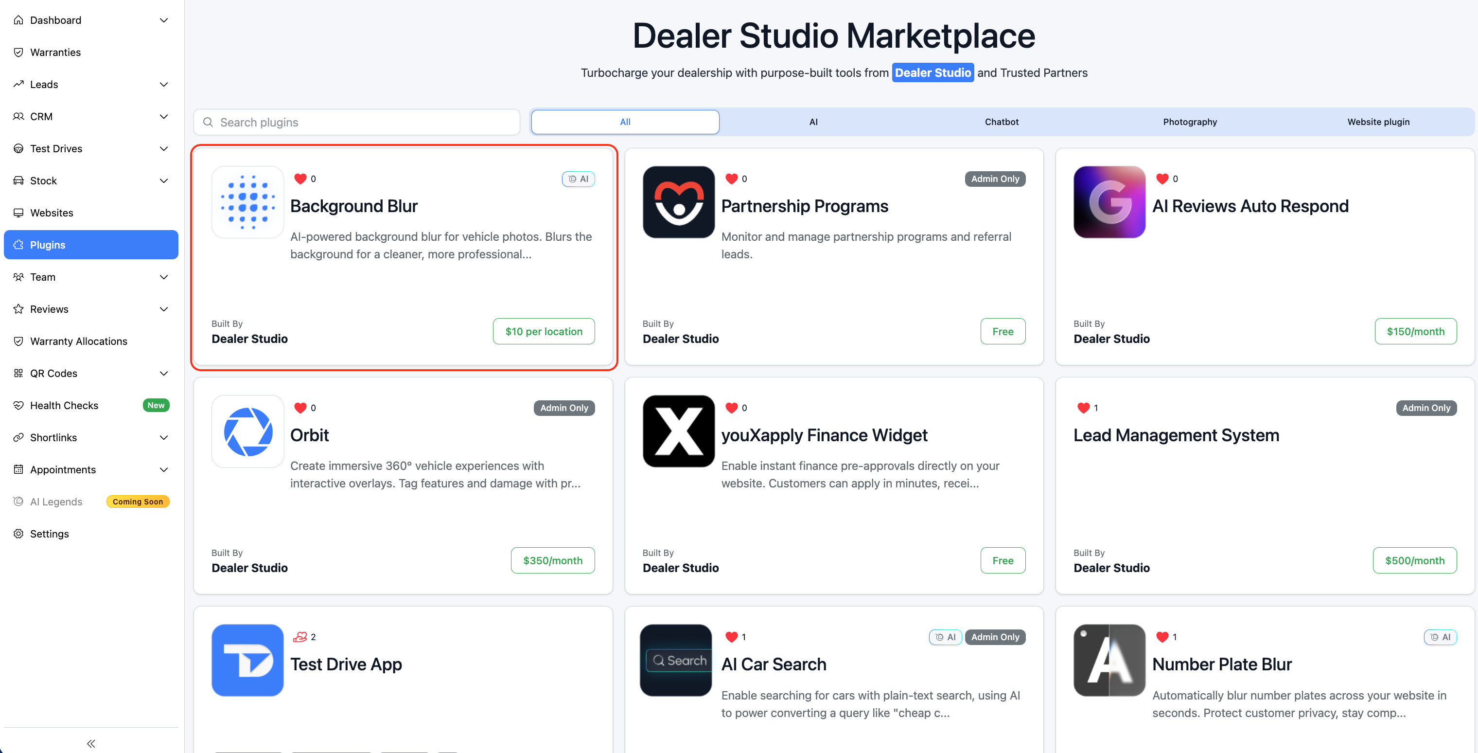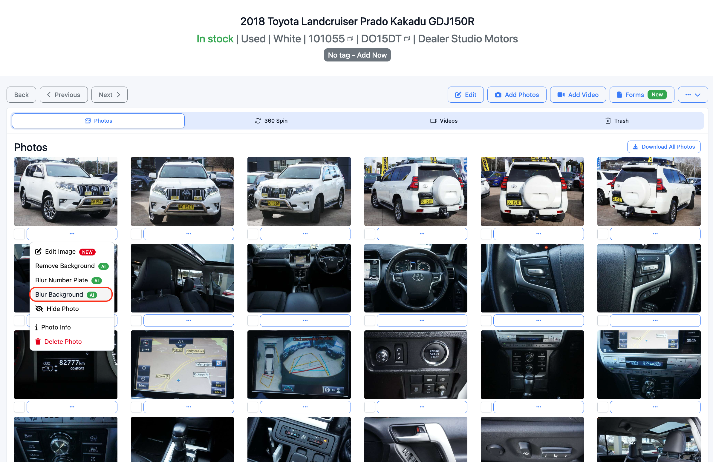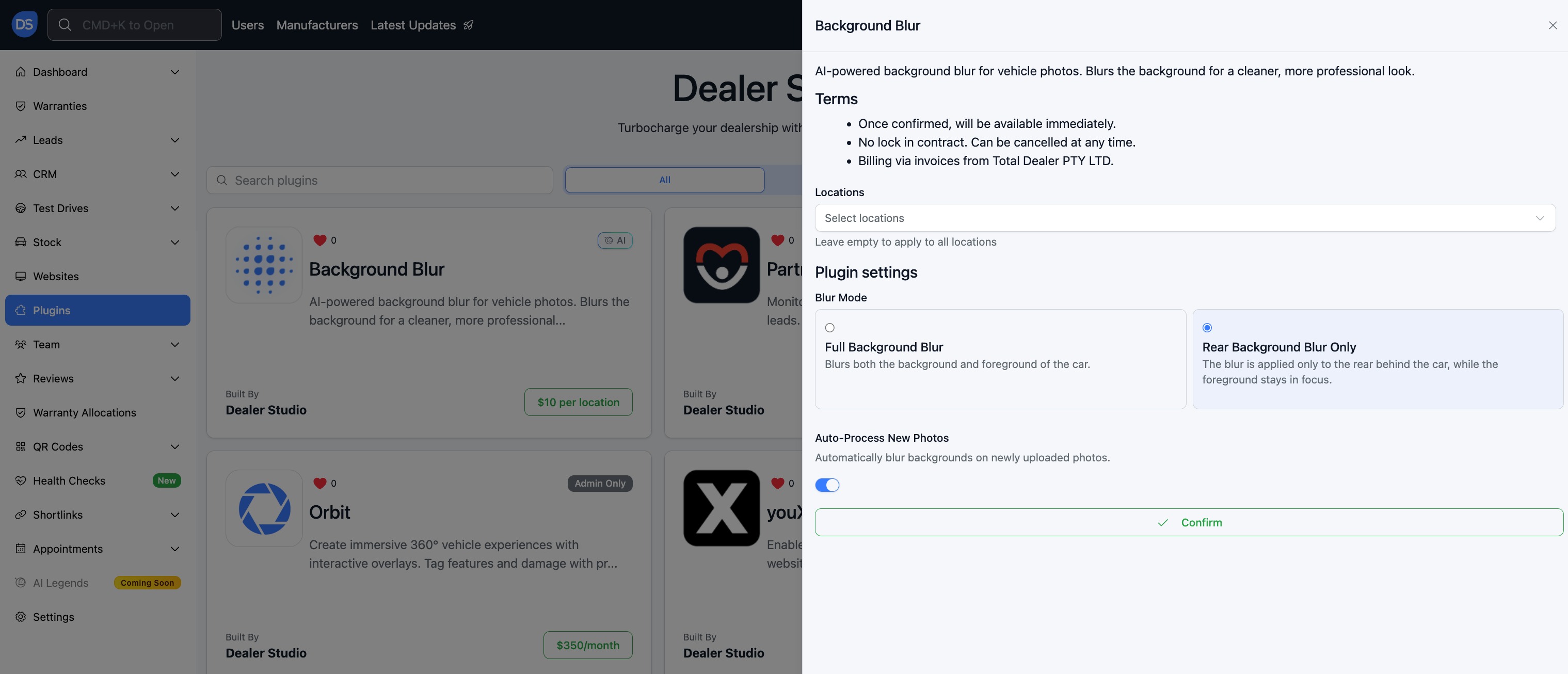 This guide explains Dealer Studio's new Background Blur plugin. It covers AI powered background blur, rear only mode, combined blur processing, opt out controls for automatic plate blurring, a manual "Blur Background" action, and per location scoping so you can switch these plugins on for specific dealership locations.
